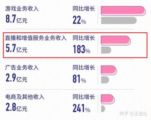 B站2019年Q4季度财报数据显示,2019年Q4季度B站的直播和增值服务业务收入为5.7亿元,同比增长183%,是B站同比增长最快业务之一同时也是B站当前非游戏业务外的第一大收入业务。