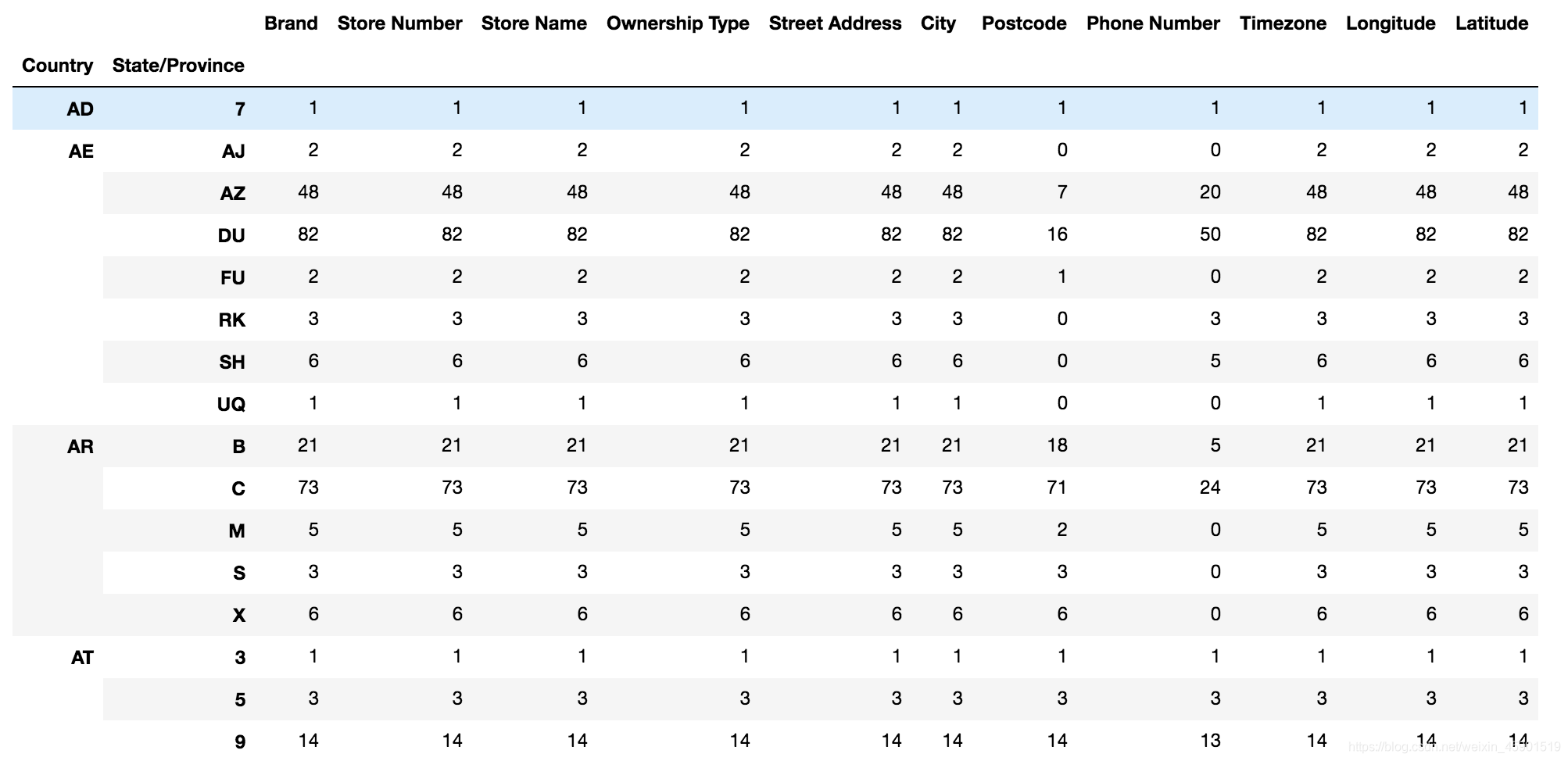 # 按照国家分组,求出每个国家的星巴克零售店数量