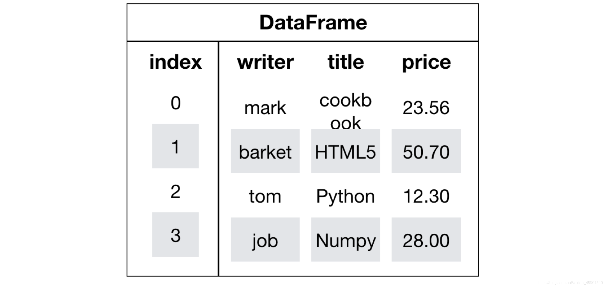 DataFrame是一个类似于二维数组或表格(如excel)的对象,既有行索引,又有列索引: