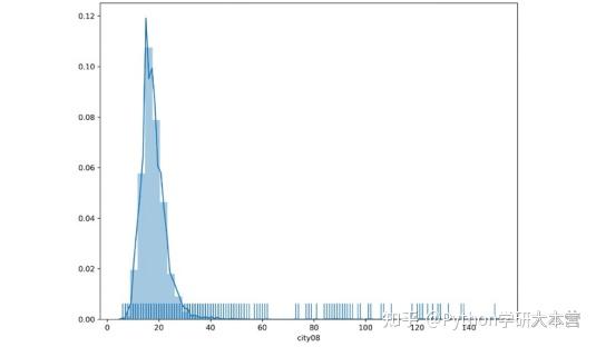 本节将检查燃油经济性数据集中的连续列。在city08列中,列出了城市道路条件下以较低速度驾驶汽车时预期的每加仑英里数。