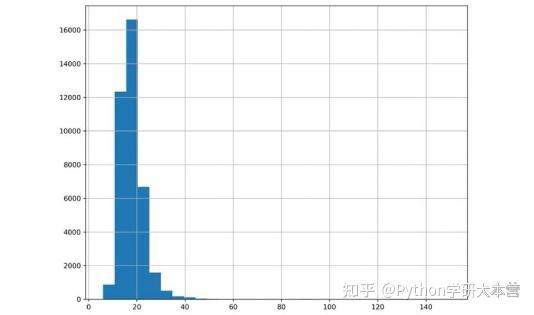 >>> fueleco.city08.hist(ax=ax, bins=30)