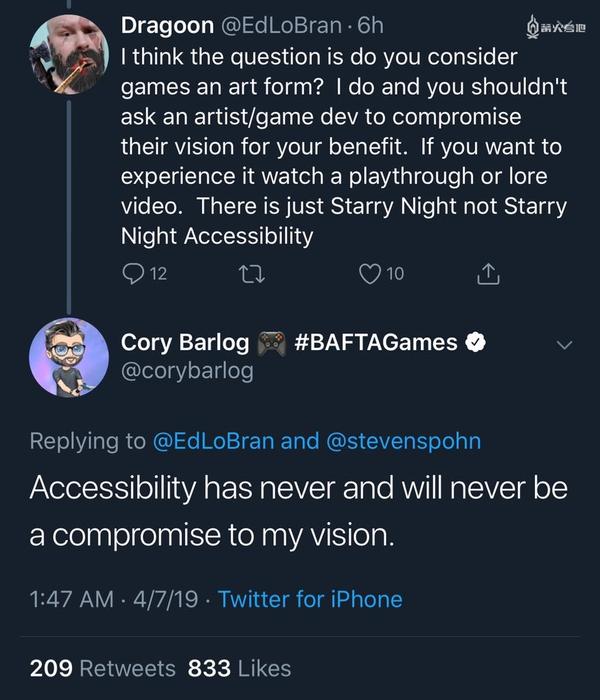 《只狼:影逝二度》曾掀起了一场关于游戏难度的激烈讨论:将「受苦」游戏变得「无障碍」,是否有碍其创作愿景的传达?或破坏游戏本身的体验?这个话题引来了许多著名业内人士的回应。比如《战神》导演 Cory Barlog 在推特上表示,「我从来,将来也不会认为无障碍(Accessibility,也译包容性)是对自身创作理念的一种妥协。对我来说,无障碍并不与个人的创作意图相对立,相反,它是你希望尽可能触及更多人的游戏体验的一部分。」